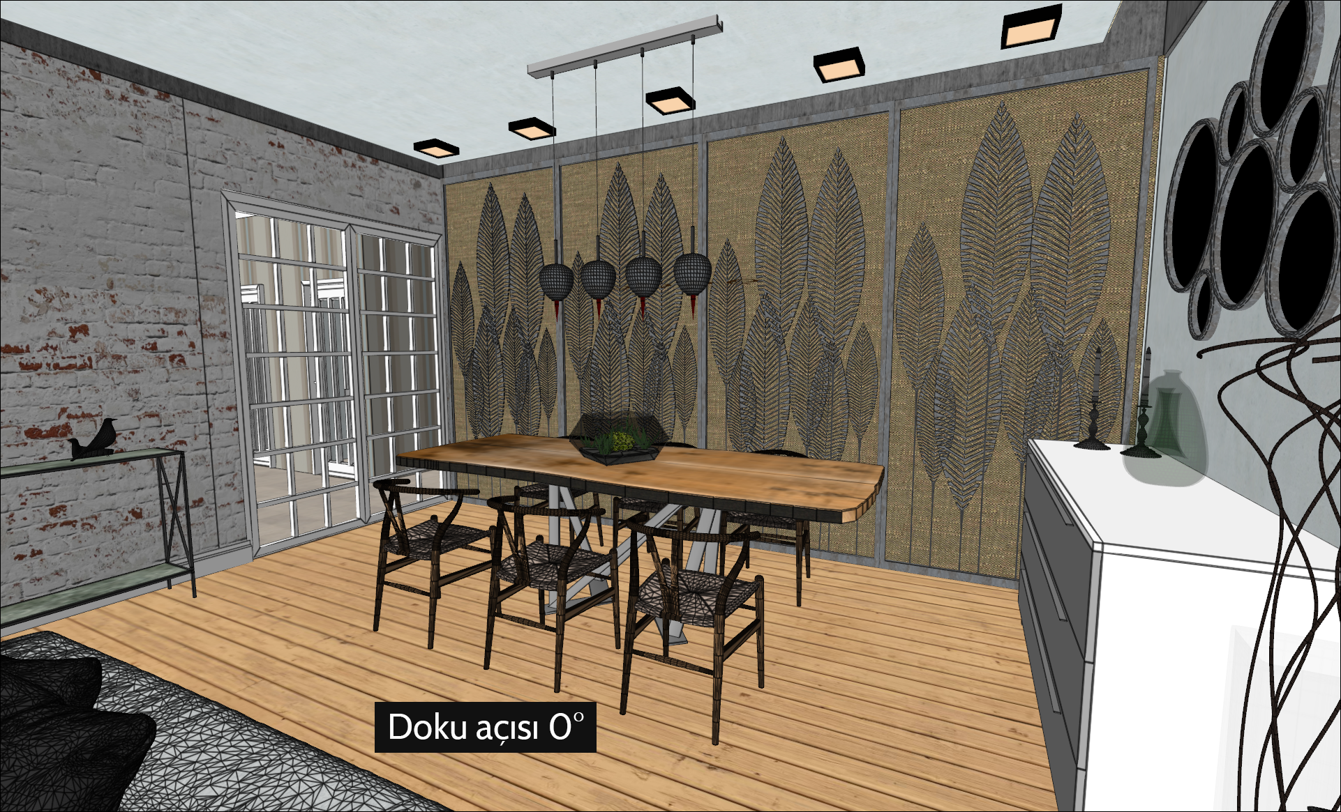 “Yüzey dokusu değiştir” komutuyla objelere atanan materyallerde düzenleme yapılır. Doku ölçeği değişimi, açı verme, öteleme, simetri alma düzenlemeleri eş zamanlı olarak perspektif ekrandan takip edilir.
