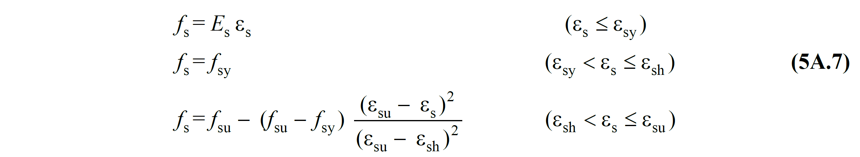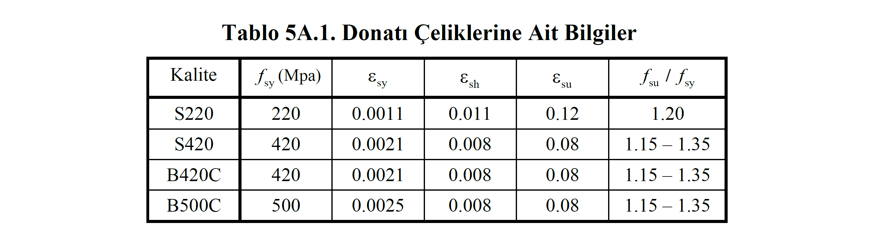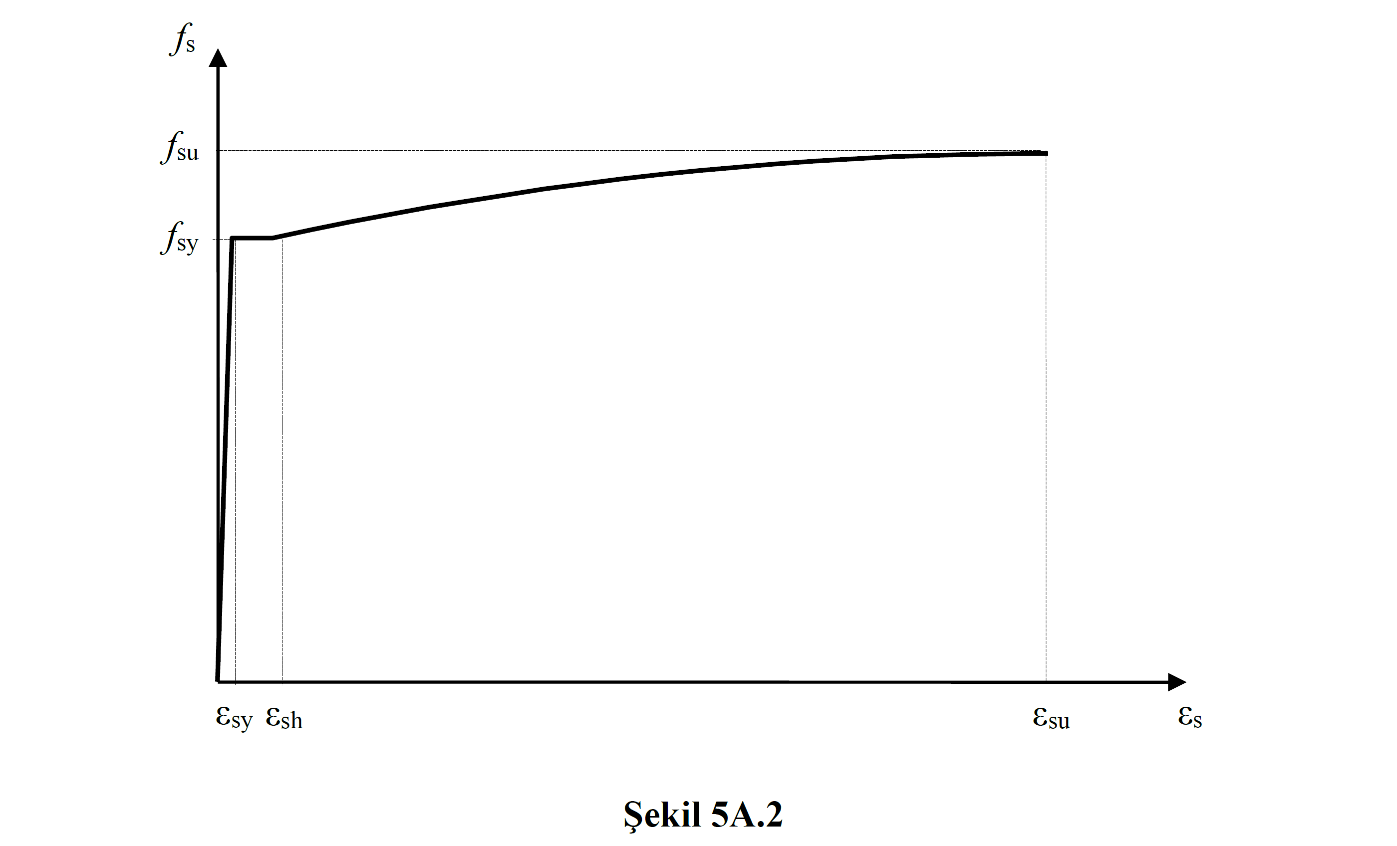 Bu denklemde fs donatı çeliğinin gerilmesini ifade etmektedir ve Şekil 5A.2 'deki grafiğin düşey eksenidir. εs donatı çeliğinin birim şekildeğiştirmesidir ve grafiğin yatay ekseni ifade eder. Donatının akma gerilmesine, fsy kadar olan bölüm doğrusaldır ve bu bölüme kadar plastik şekildeğiştirme meydana gelmemektedir. Donatının akma noktası (fsy, εsy) 'na ulaşıldıktan sonra gerilme sabit kalır ve pekleşme bölgesine kadar birim şekildeğiştirme artış gösterir. Pekleşme başlangıç noktası (fsy, εsh) 'ndan sonra donatıdaki gerilme bir miktar artmaya devam eder ve en son (fsu, εsu) noktasında donatı dayanımını yitirir. Donatı çeliğinin kalitesine göre akma gerilmesi fsy ve akma birim şekildeğiştirmesi εsy değişiklik göstermektedir. Tablo 5A.1 'de donatı kalitesine göre malzeme modelinde kullanılan değerler gösterilmektedir.