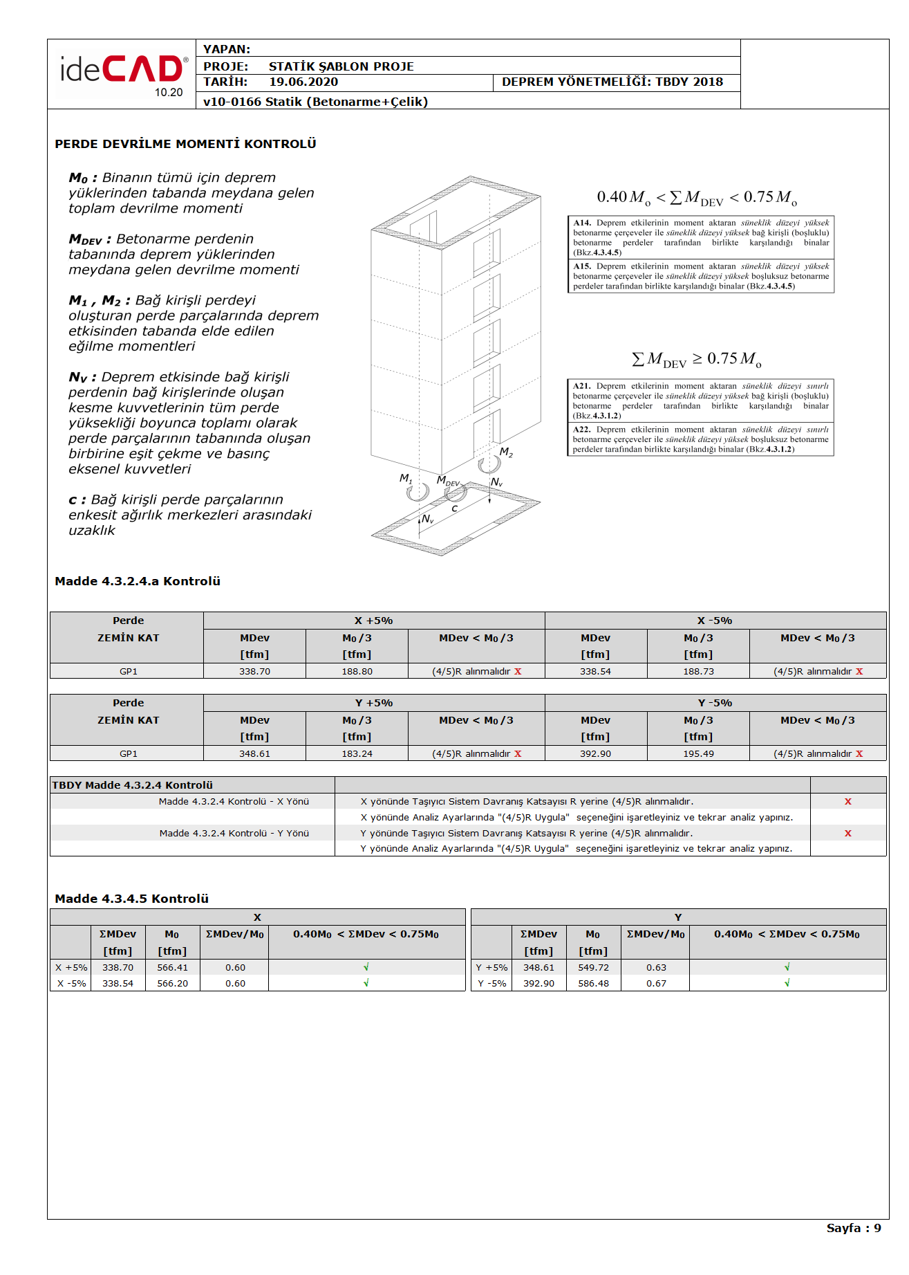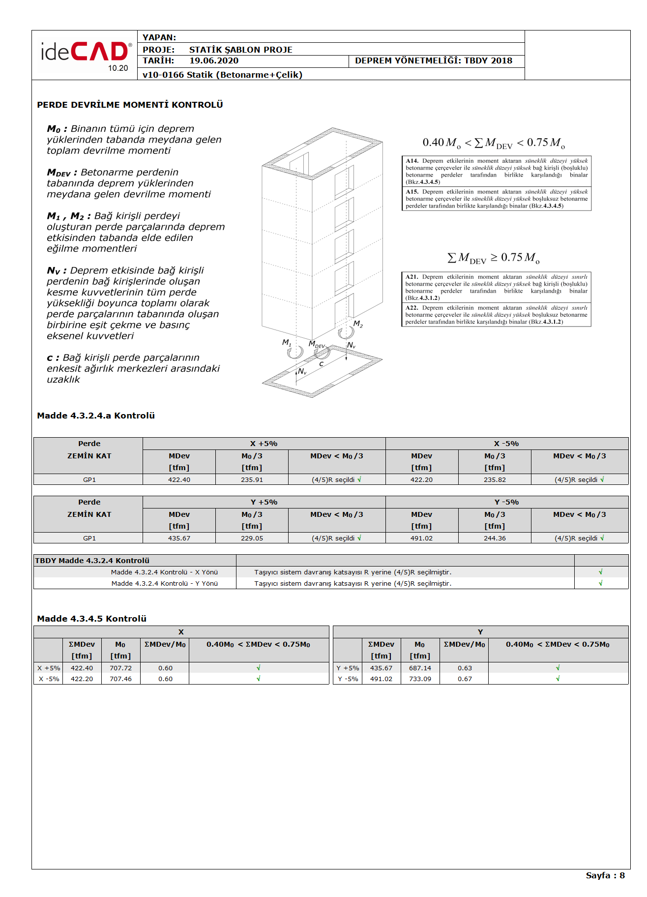 Perdelerin taban devrilme momenti MDEV ve deprem yüklerinden meydana gelen toplam taban devrilme momenti Mo , TBDY Madde EK 4B.2.5 'te anlatıldığı üzere modal hesap yöntemleri ile hesaplanmaktadır. Detaylı hesap Bağ Kirişli (Boşluklu) Perdelerin Modellenmesi başlığı altında bulunmaktadır.