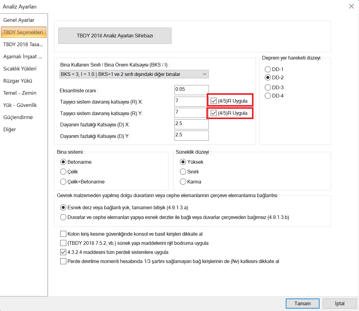 Taşıyıcı Sistem Davranış Katsayısı R yerine (4/5)R katsayısını dikkate almak için “Analiz Ayarları” penceresindeki “TBDY Seçenekleri” sekmesinden “(4/5)R Uygula” seçeneğinin işaretlenmesi gerekmektedir. Aşağıdaki resimde “(4/5)R Uygula” seçeneğinin bulunduğu yer kırmızı ile işaretlenmiştir.
