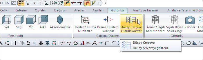 Düşey çerçeve düzlemleri, aks seçilerek seçilen aksın düşey hizasında istenilen sayıda oluşturulur. Ortografik (2 boyutlu) ya da perspektif izdüşüm seçeneklerinden biri seçilir.