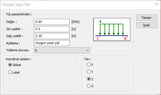 | Yön  Yükün hangi yönde geçerli olduğu bilgisini verin. X, Y, Z global koordinat sistemine göre, 1 ,2 3 lokal koordinat eksenini göre yükün yönünü gösterir. G ise bu yükün sabit (düşey) yük olduğunu gösterir. |