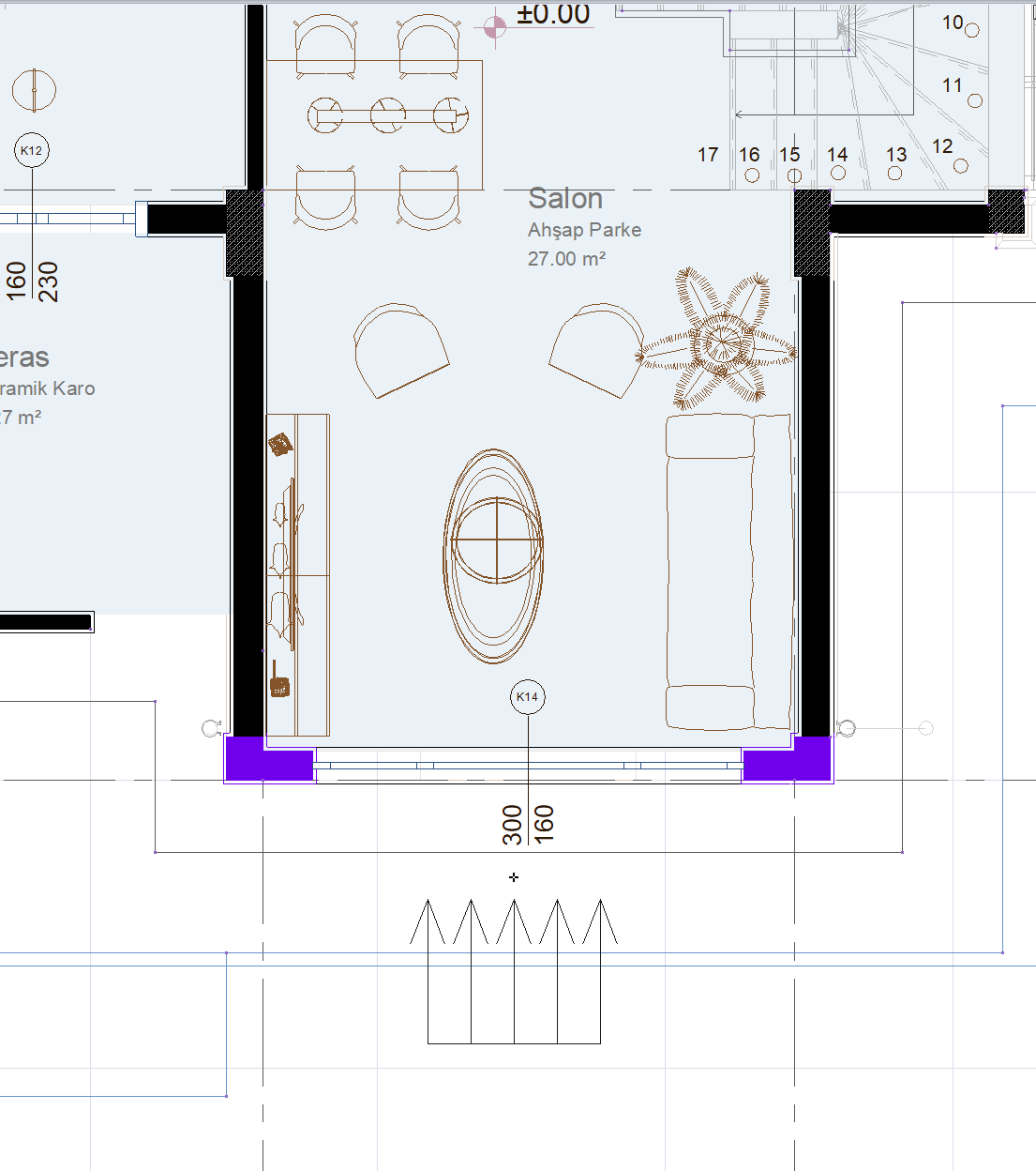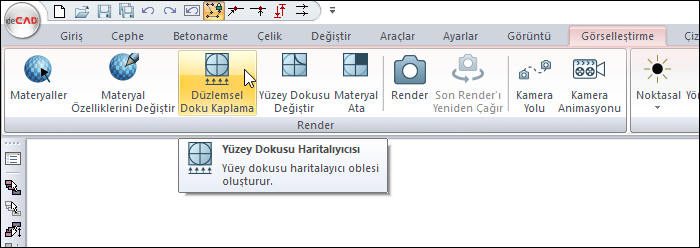 Düzlemsel Doku Kaplama komutu ile aynı cephede yer alan duvar, kolon, kiriş gibi farklı objelerin yüzeylerine atanan materyalin devamlılığı sağlanır.