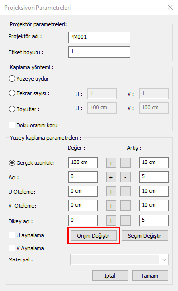 Tanımlanan düzlemsel doku kaplama projeksiyonun üzerine çift tıklandığında açılan projeksiyon parametreleri diyaloğundan orijini değiştir özelliğine ulaşabilirsiniz.