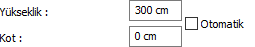 Yükseklik ve kot ![]() Duvar yüksekliği girilir. Duvar yüksekliği kat tabanından başlayarak duvarın yüksekliğini belirler. Duvarlarda bulunan otomatik özelliği aktif hale getirilerek, duvar kot ve yükseklikleri girilen kiriş ve döşemeler dikkate alınarak otomatik hesaplanır. Duvar alt yüzünün (duvar tabanı) kat tabanından ölçülen düşey mesafesi (kotu) girilir. |