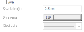 Sıva ![]() Sıva seçeneği işaretlendiğinde belirlenen kalınlıkta sıva duvar çevresinde oluşacaktır. Planda çizilecek sıva kalınlığı girilir. Duvarların plandaki sıva rengi seçilir. Renk kutucuğu tıklandığında açılan pencereden uygun renk seçilir. |