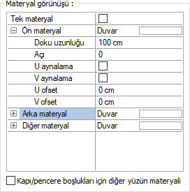 Materyal görünüşü ![]() Duvarın ön, arka ve diğer yüzeylerinde kullanılacak materyal listeden seçilir. Yüzeyler seçilen materyal ile kaplanır ve renderlarda bu şekilde görüntülenir. Gerçek doku uzunluğuna doku uzunluğu girilir. Örneğin; 1 girilirse seçilen materyal dokusu genişliği 1 metre olarak alınır ve ilgili duvarlar üzerine kaplanır. Açııya, dokunun açısı girilir. U ve V ötelemeye dokunun x ve y düzlemindeki hareket değeri girilir. U ve V aynalama ile dokunun y ve x düzlemine göre simetrisi alınır. Tek materyal seçeneği işaretlenerek, duvarın tüm yüzeylerinde, “Ön materyal” ‘de seçilen materyal kullanılır. |