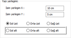 Yazı yerleşimi ![]() İsim yerleşim X ve isim yerleşim Y bölümüne duvar adı yazısının, duvar sol noktasına (isim duvar üstünde ise duvar üstü sol noktasına) göre X ve Y koordinatları girilir. Yazı yerleşim noktaları işaretlenerek duvar isim yazısının duvarın neresinde gösterileceği belirlenir. |