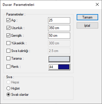 Sıva/Sıvalı olanlar ![]() İşaretlenirse, seçilen duvarlardan sadece çizilirken sıvalı olarak çizilen duvarlar sıvalı hale dönüştürülür. |
