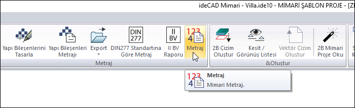 Ribbon menü araçlar sekmesi Metraj başlığı altından ulaşabilirsiniz.