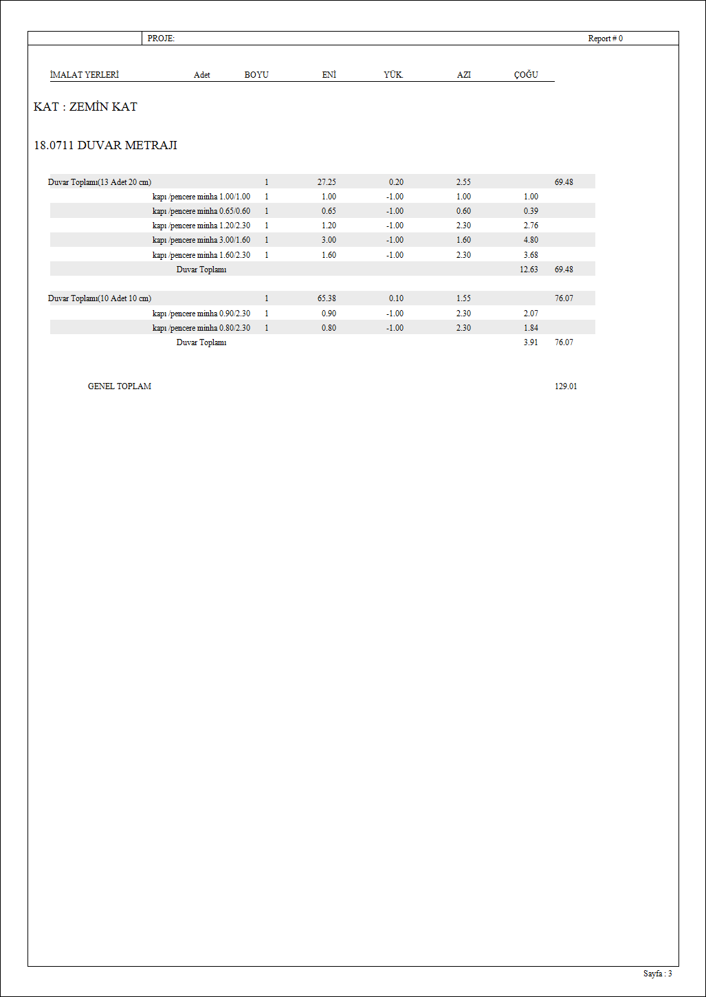 Metraj raporu duvar metrajı, iç sıva metrajı ve tavan sıvası metrajı olmak üzere üç kısımdan oluşur. Duvarlar ve sıvalar tanımlıysa duvar ve iç sıva metrajları oluşturulur. Kapı/pencere boşlukları düşülür ve minha olarak detaylarda basılır. Tavan sıvası metrajı için mahallerin tanımlanmış olması gerekir. Mahaller tanımlandıysa tavan sıvası metrajı da oluşturulur.