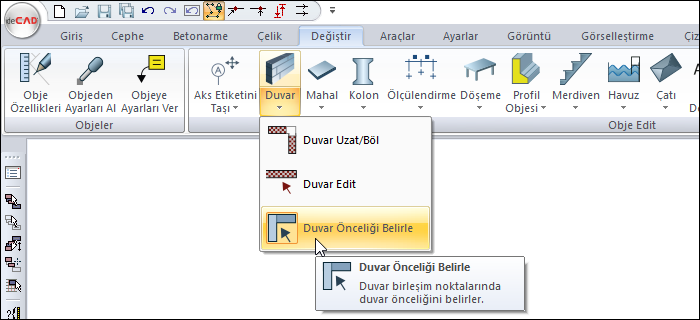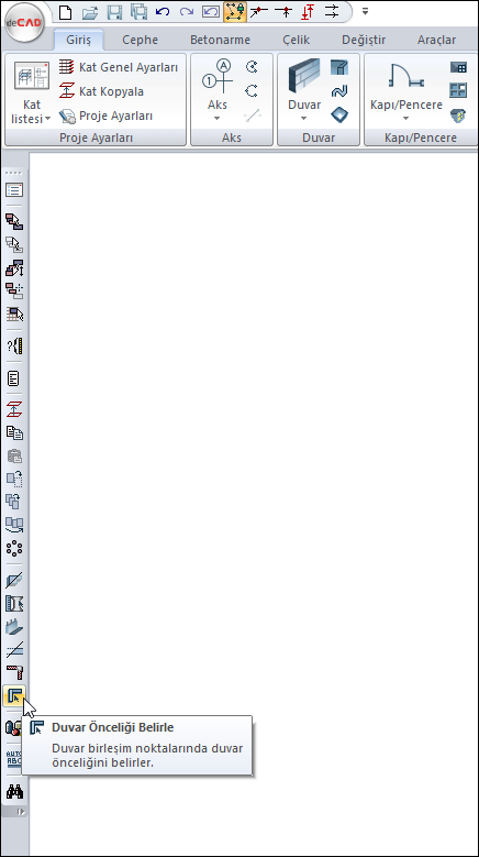 Duvar Önceliği Belirle komutu bir noktada kesişen iki veya daha çok sayıda duvarın kesişim önceliğinin belirlenmesini sağlar. Duvar birleşim grupları belirlenir. Aynı numaralı duvarlar kendi içerisinde kesiştirilir. Farklı numaralı duvarlar kesiştirilmez. Duvar öncelik numarası farklı verilmiş duvarlar birbirilerinden ayrılmış şekilde çizilir.
