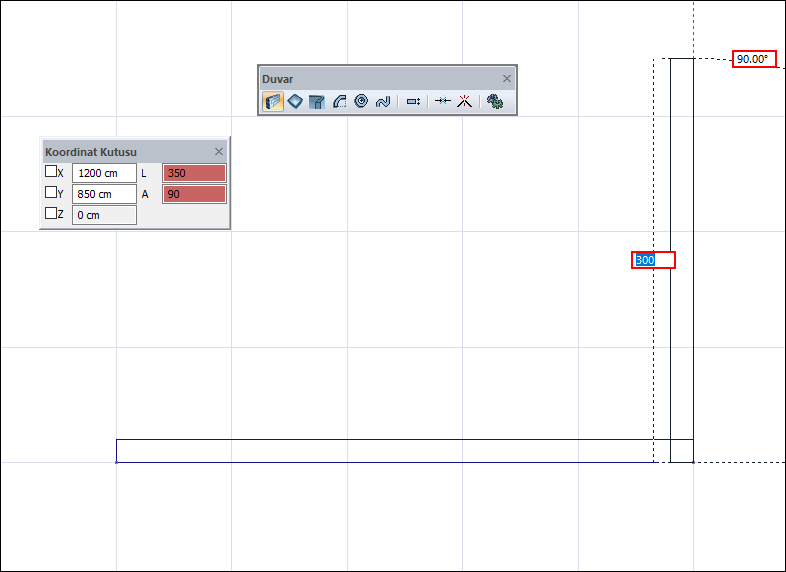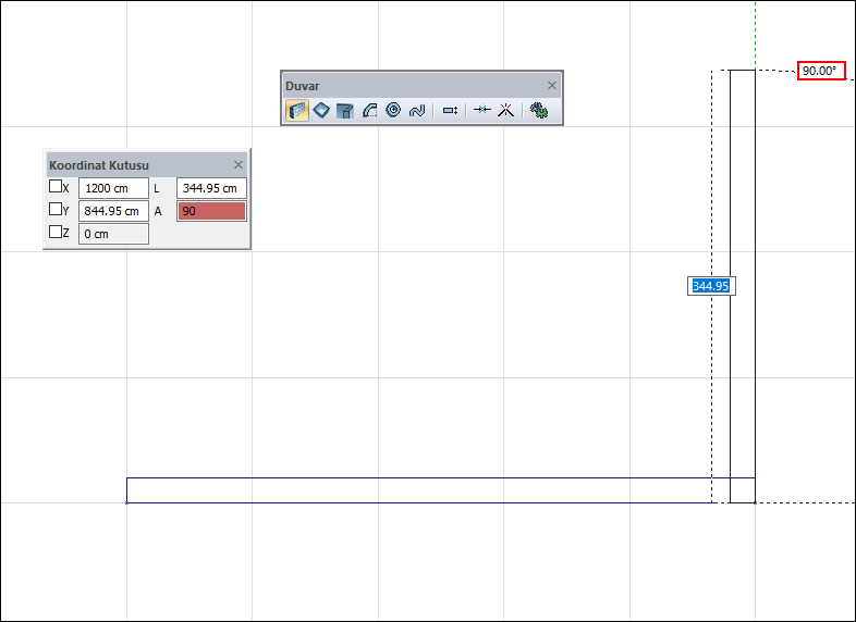 Duvarın doğrultusu için klavyeden A tuşuna basılıp 90 değeri girilmesi ve Enter tuşuna basılarak açının kilitlenmesi ![]() |