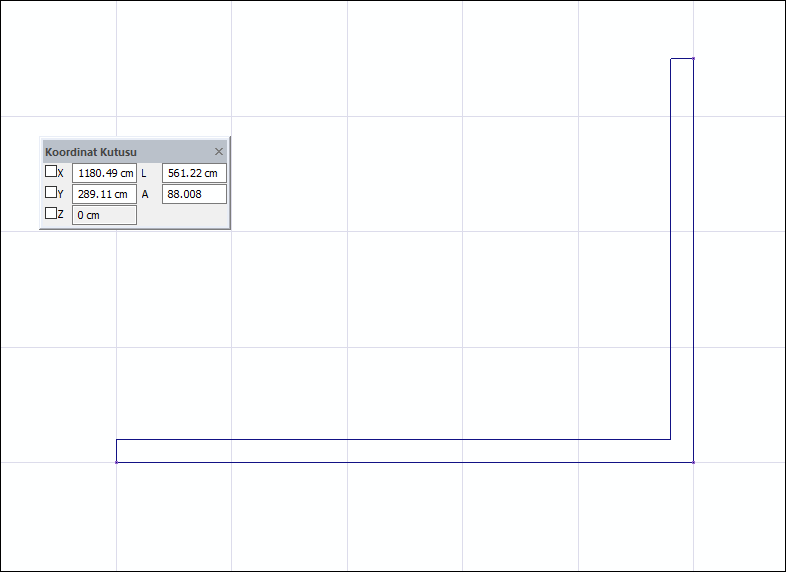 Uzunluk girmek için ise klavyeden L tuşuna basın. İmleç koordinat kutusundaki L hanesine gidecektir. Buraya uzunluk değeri olarak 350 (cm) girin ve enter tuşuna basın. Çizilmekte olan duvar uzunluk değeriyle sınırlanacaktır.