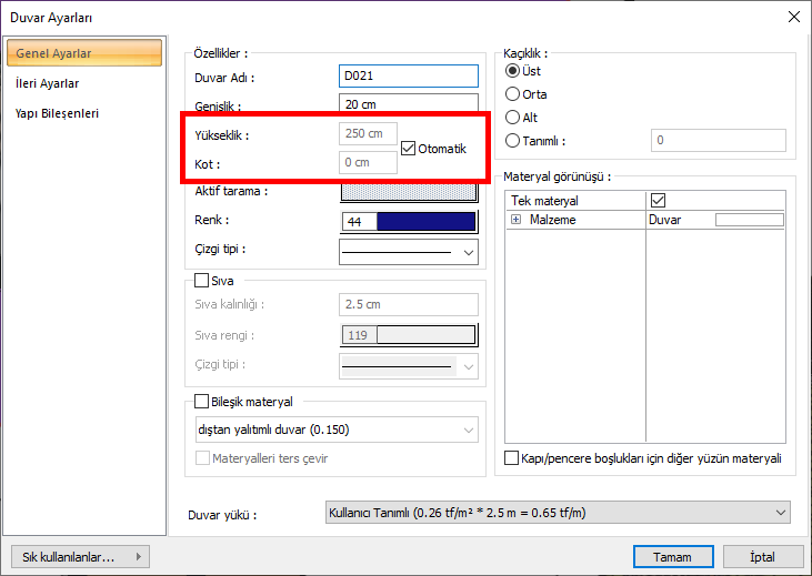 Duvar ayarlarında yer alan yükseklik değeri, kat tabanından başlayarak duvarın yüksekliğini tanımlar. Kullanıcı tarafından belirlenir. Otomatik özelliği aktif edilerek, duvar kot ve yükseklikleri kat genel ayarlarında belirlenen yükseklik ve kot değerlerine göre otomatik hesaplanır. Duvar yükseklikleri hesaplanırken girilen kiriş ve döşemeler dikkate alınır.