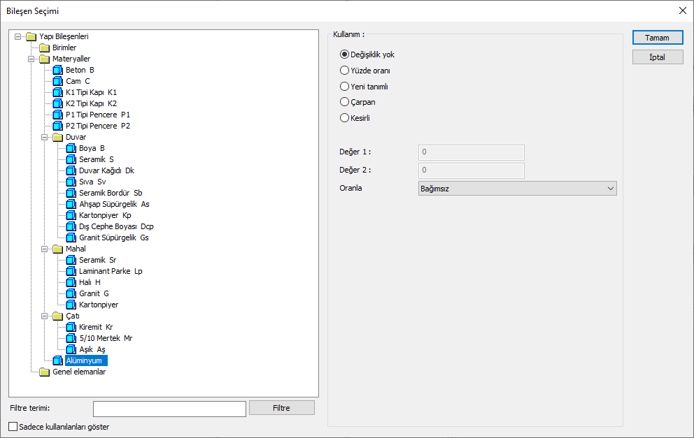 Yapı bileşenleri ekle: Detaylı yapı bileşenleri metrajı için tanımlanan yapı malzemelerini objeye atar.