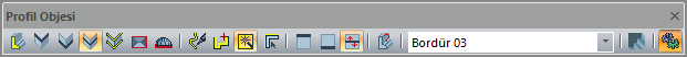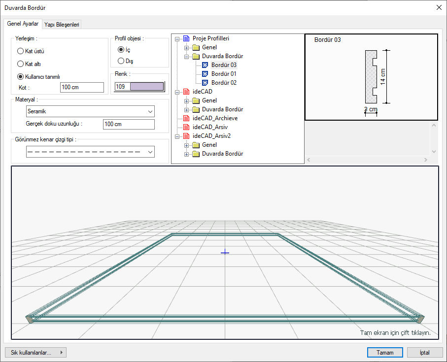Proje profilleri ![]() Duvarda bordüre ait profillerin listesidir. Seçilen profil çevreleme elemanında kullanılacaktır. Profil ön görüntüsü sağ tarafta çizilmektedir. |