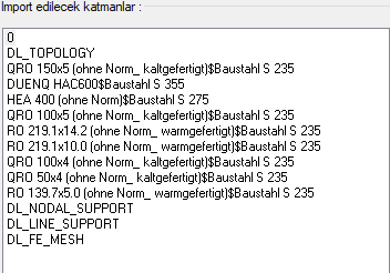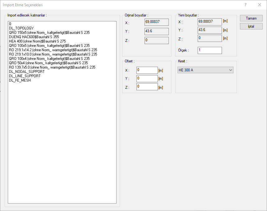 Kesit ![]() Import edilen katmanlar için çelik yapıda kullanılacak kesit listeden seçilir. Eğer liste boşsa Yeni Oluştur satırı tıklanarak kesit kütüphanesinden kesit seçilir. |
