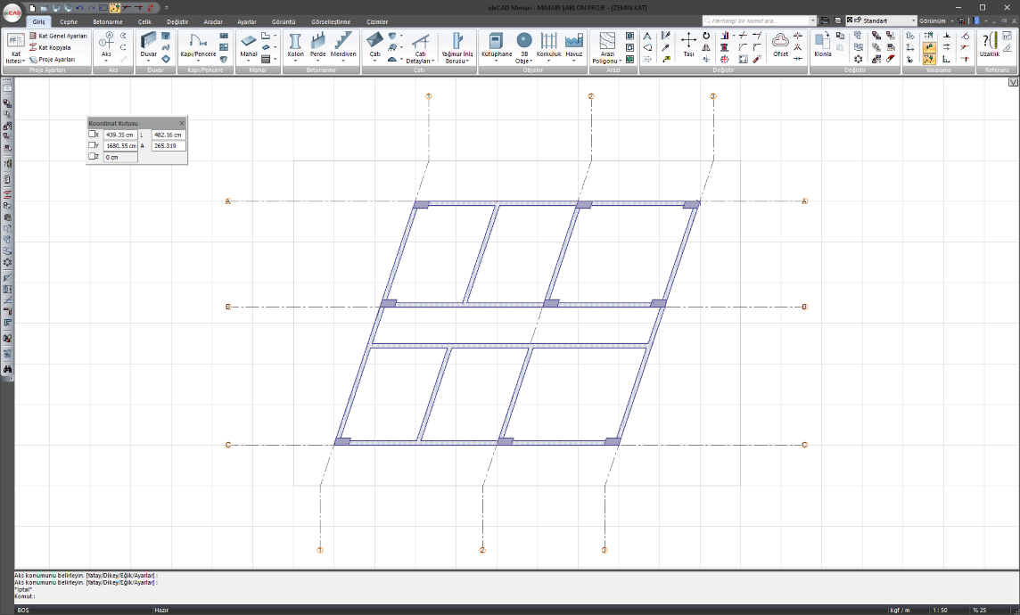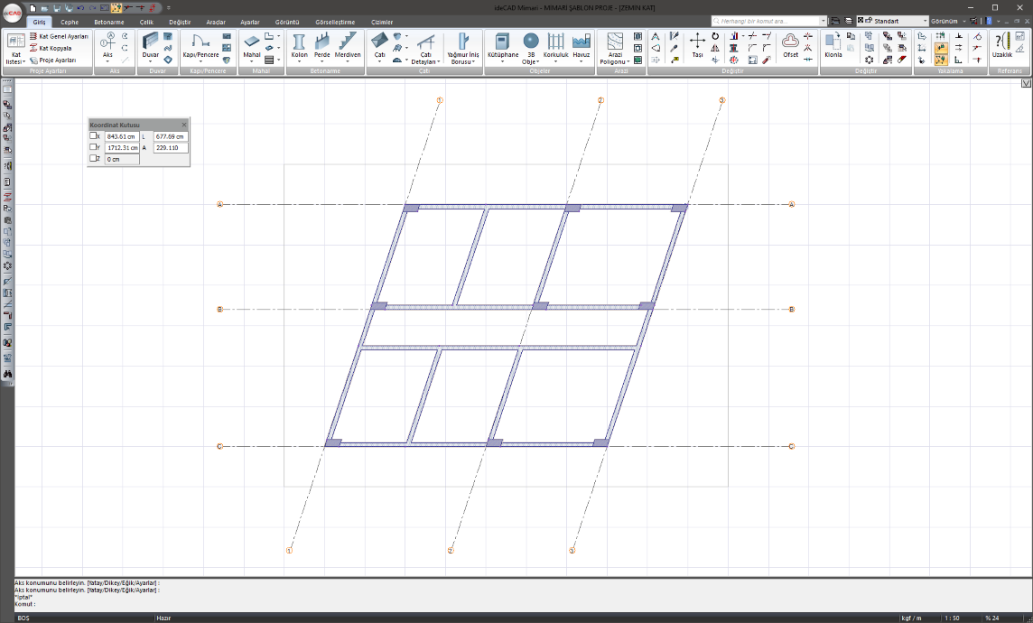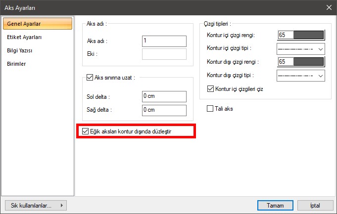 Eğik aksların kontur dışında kalan kısımları Aks ayarlarından "Eğik aksları kontur dışında düzleştir" seçeneği ile düz çizdirilir.