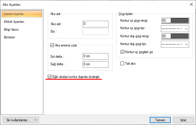 Aks ayarları diyaloğundan Eğik Aksları Kontur Dışında Düzleştir özelliğine ulaşabilirsiniz.