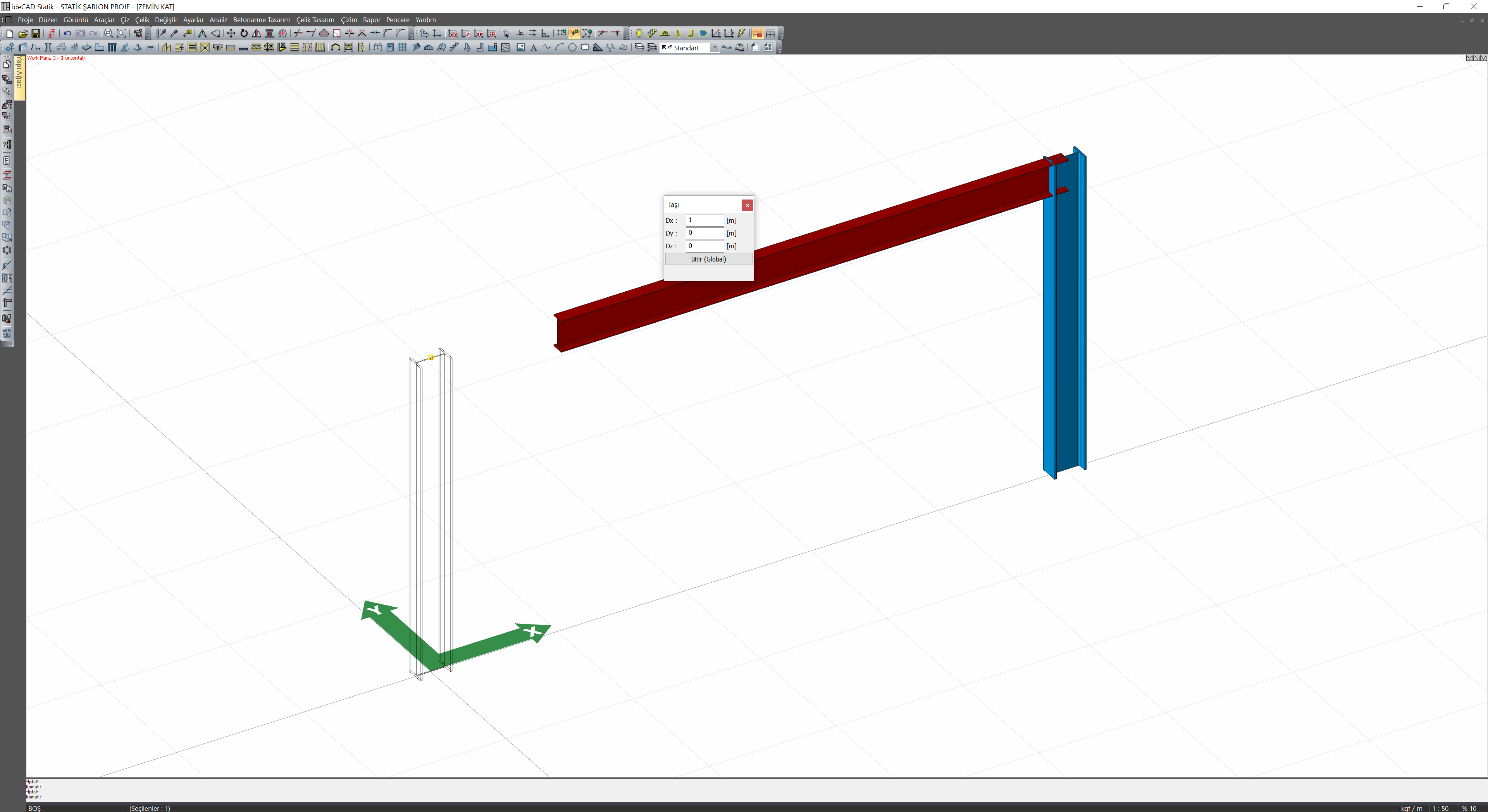 X-Y düzlemine dik tanımlanmış bir çelik kolona tıklayıp daha sonra kolonun üst düğüm noktasına tıkladıktan sonra küçük bir pencere açılacaktır. Bu pencerede Dx, Dy, Dz bölümlerine uygun değerler girildiğinde çelik kolona eğiklik verilebilir.