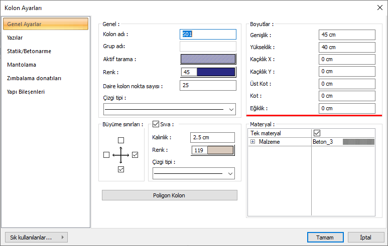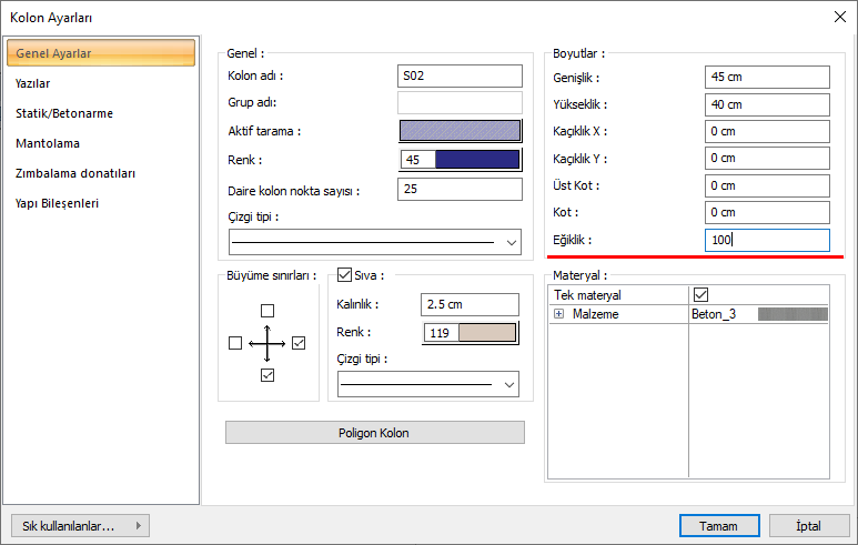 Genel Ayarlar sekmesinde Eğiklik parametresine bir değer girin. Burada girilecek değer kolon alt ve üst noktaları arasındaki mesafeyi ifade eder.