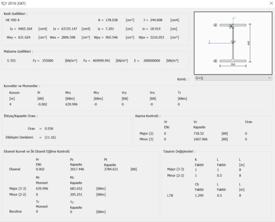 Yanal stabilite bağlantısı ile desteklenen noktalar arasında kiriş uzunluğu boyunca Cb katsayısı 1.3 olarak hesaplandı.
