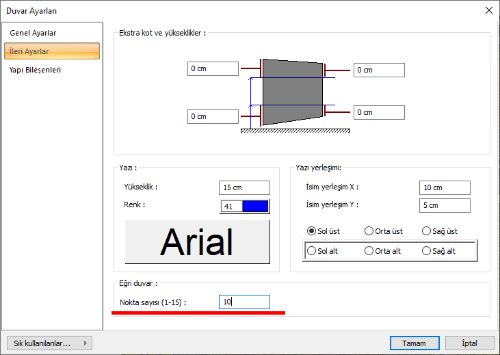 Eğrisel ve dairesel duvar çizilirken Nokta Sayısı özelliği ile duvarların eğriselliği ayarlanır. Nokta sayısı olarak maksimum 15 girilir.