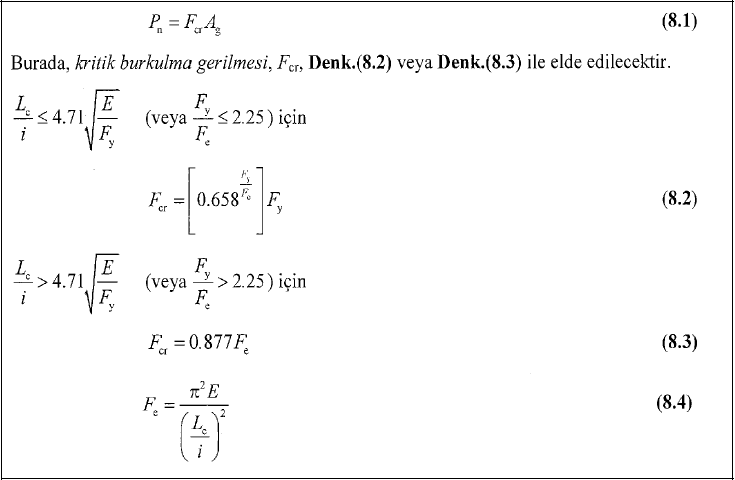 Eksenel kuvvetin kesit ağırlık merkezinden etkimesi durumuna göre, elemanların basınç dayanımı belirlenir. Yönetmelik gereği, eğilmeli burkulma sınır durumu, enkesit özelliklerinden bağımsız olarak, tüm basınç elemanlarında dikkate alınır. Bunun için kullanılan denklemler sıra ile aşağıda verilmiştir.