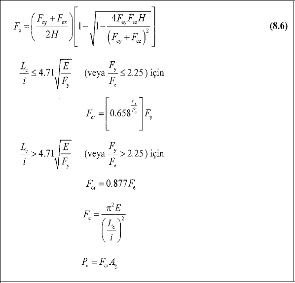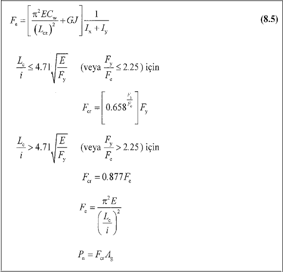 Burkulmanın, elemanın boyuna ekseni etrafında dönmesiyle oluştuğu burulmalı burkulma sınır durumunda (+ şekilli yapma enkesitli veya sırt sırta yerleştirilmiş 4 korniyerden oluşan açık enkesitli basınç elemanları) elastik burkulma gerilmesi, Fe denklem 8.5 ile hesaplanır.