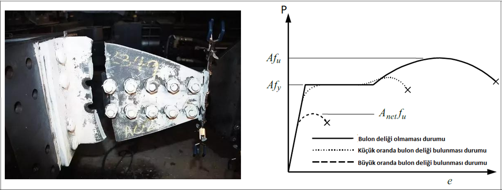 Eksenel çekme etkisindeki elemanların bulonlu birleşimler ile birlikte kullanılması halinde, bulon deliklerinin yer aldığı bölgelerde akma gerilmesine daha önce ulaşılacaktır. Bu durum ise yük – yer değiştirme eğrisi kullanılarak, doğrusal elastik kabulü ile yapılan dayanım hesaplarını etkileyecektir.