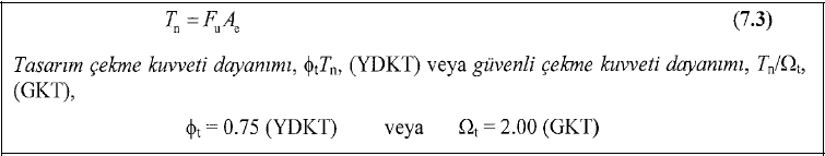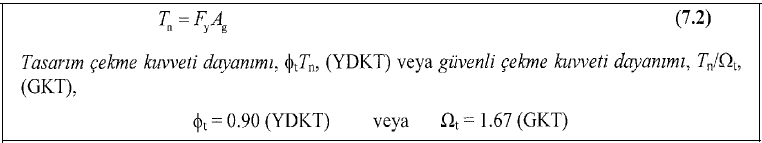 Çekme elemanlarında akma sınır durumu için karakteristik çekme kuvveti dayanımı, Tn kayıpsız enkesit alanı kullanılarak denklem 7.2 ile hesaplanır.
