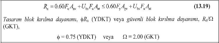 Karakteristik blok kırılma dayanımı, Rn kesme yüzeyi veya yüzeyleri boyunca akma ve kırılma sınır durumları ile dik çekme yüzeyi boyunca kopma sınır durumları esas alınarak, denklem 13.19 ile hesaplanmaktadır.