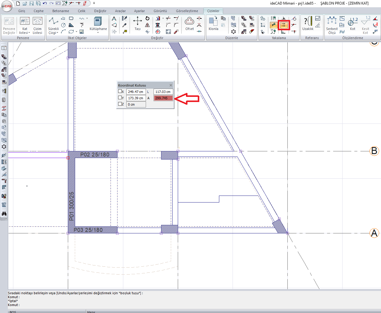 Bir elemanın açısı, "Paralel Referans" komutu kullanılarak öğrenilebilir.