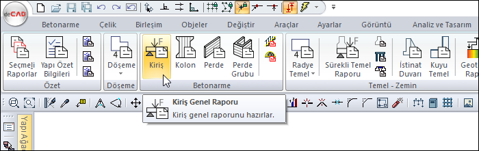 Ribbon menü raporlar sekmesi Betonarme başlığı altından ulaşabilirsiniz.