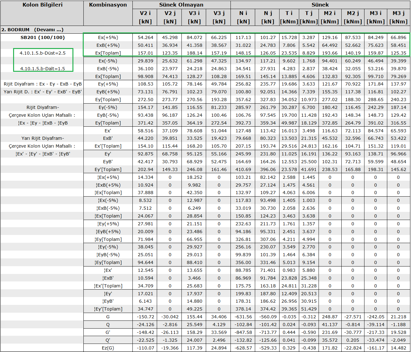 Örneğin yukarıdaki tabloda 2.Bodrum kat S01 kolonu analiz sonrası tasarıma esas iç kuvvetler hesabı verilmiştir. EX yönünü detaylı inceleyecek olursak sünek olmayan davranış için V2(i) hesabı şu şekildedir: