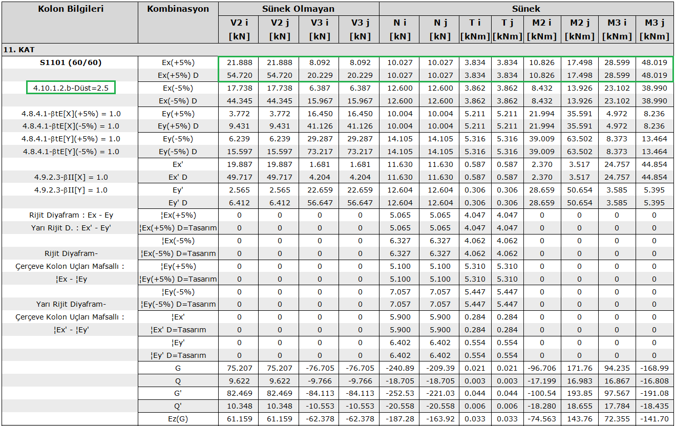 Örneğin yukarıdaki tabloda 11.kat S01 kolonu analiz sonrası tasarıma esas iç kuvvetler hesabı verilmiştir. EX yönünü detaylı inceleyecek olursak sünek olmayan davranış için V2(i) hesabı şu şekildedir: