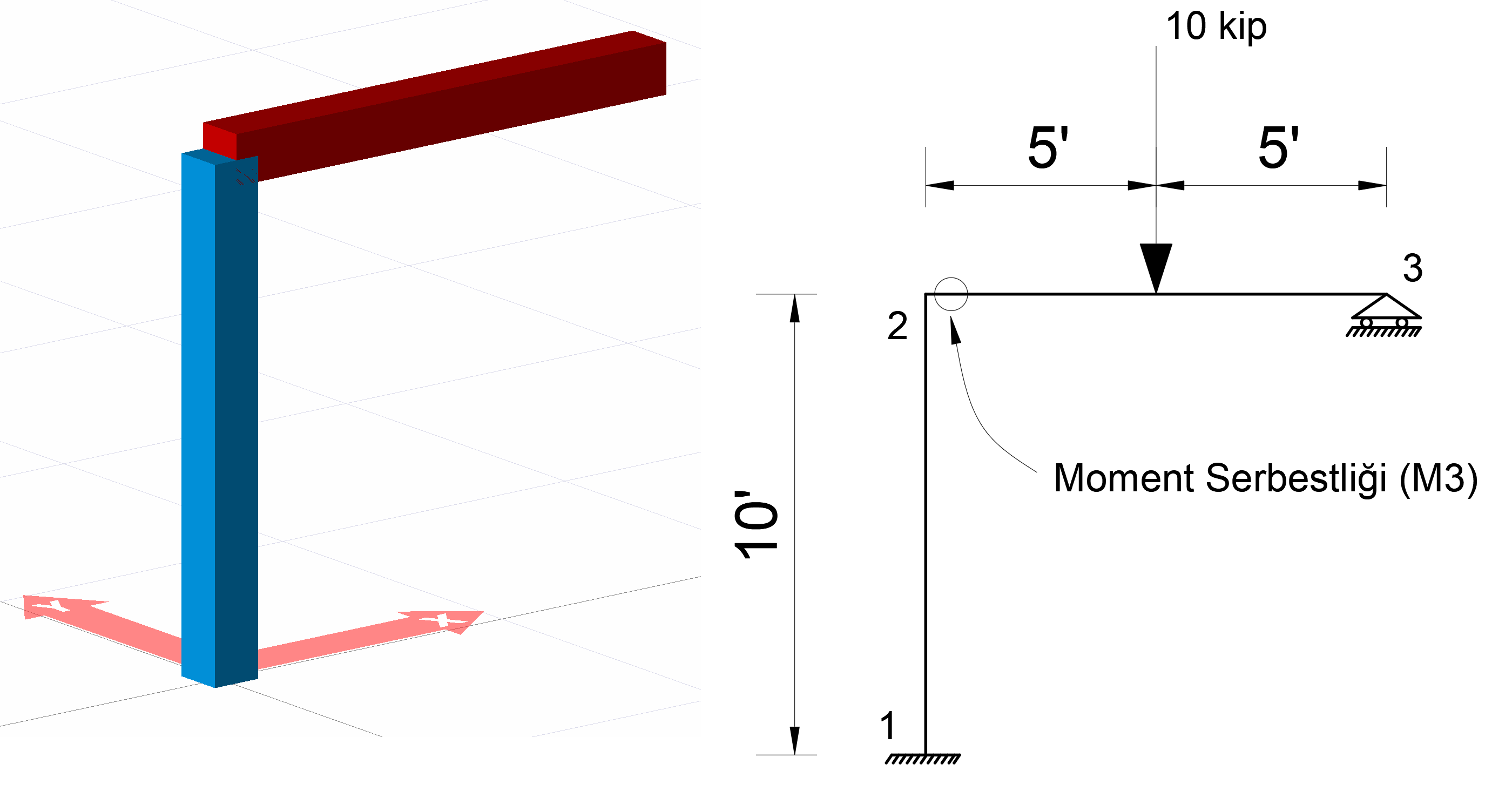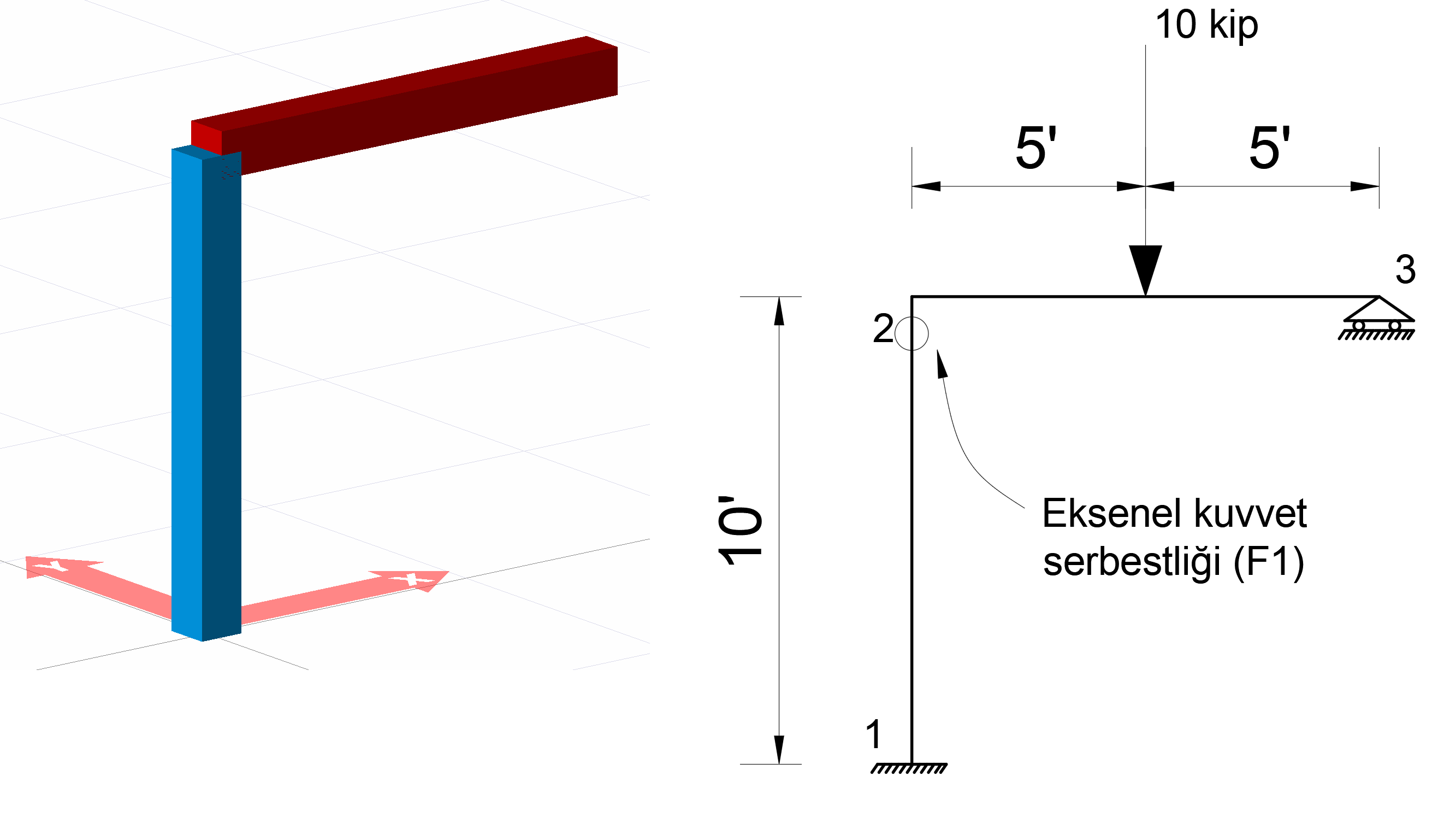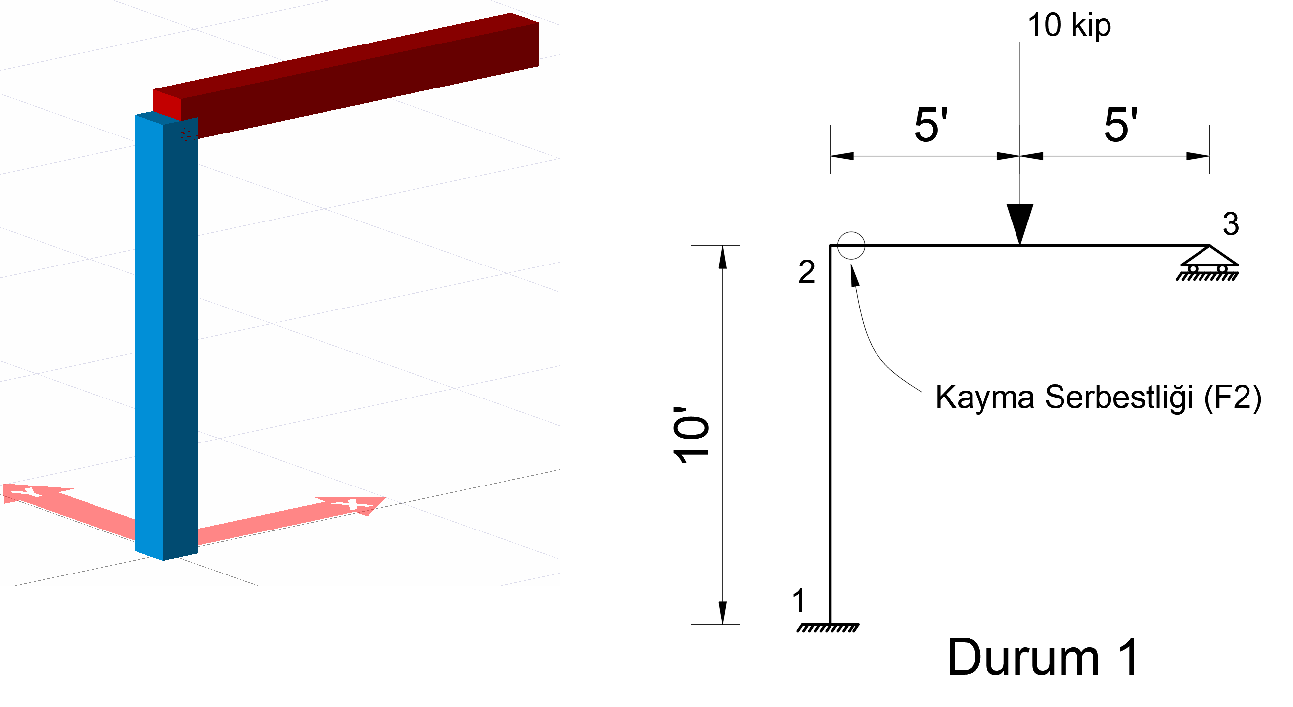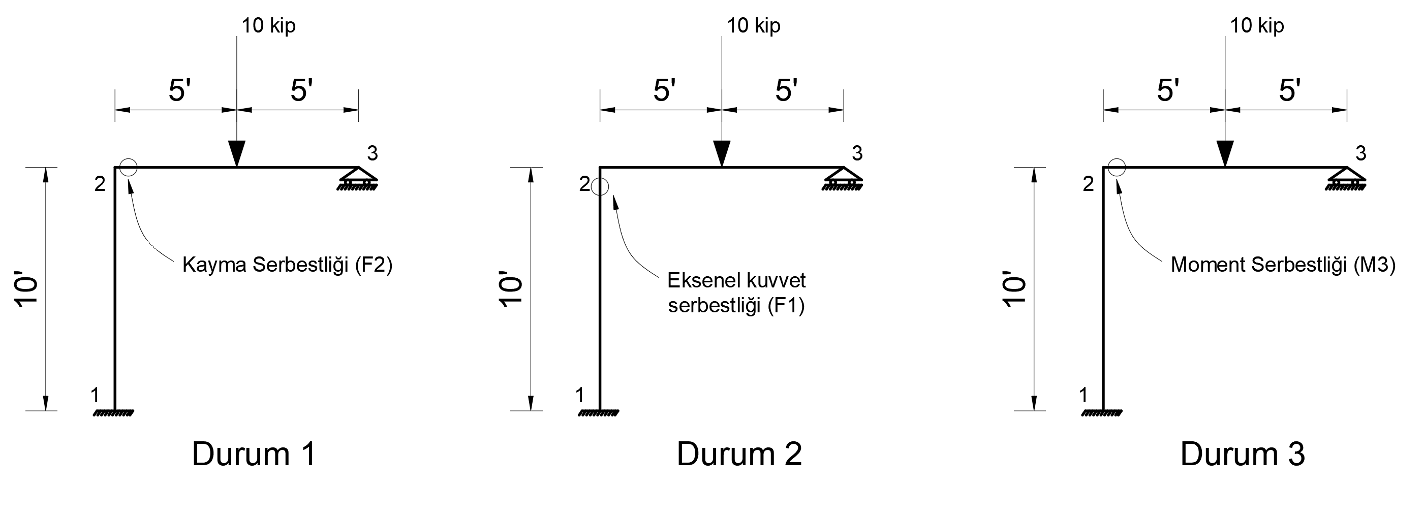 Yukarıdaki sisteme, aşağıda belirtilen 3 adet mesnet koşulu tanımlanmıştır. Bu koşullar Durum 1, Durum 2 ve Durum 3 olarak isimlendirilmiştir. Durum 1 için 2-3 düğüm noktaları arasında kalan çubuğun 2 numaralı düğüm noktasında bulunan ucuna kayma serbestliği (F2), Durum 2 için 1-2 düğüm noktaları arasında kalan çubuğun 2 numaralı düğüm noktasında bulunan ucuna eksenel kuvvet serebstliği (F1) ve Durum 3 için 2-3 düğüm noktaları arasında kalan çubuğun 2 numaralı düğüm noktasında bulunan ucuna e moment serbestliği (M3) tanımlanmıştır. Bütün mesnet koşullarında 2-3 düğüm noktaları arasında kalan çubuğun ortasından 10 kip 'lik tekil yük uygulanmıştır.