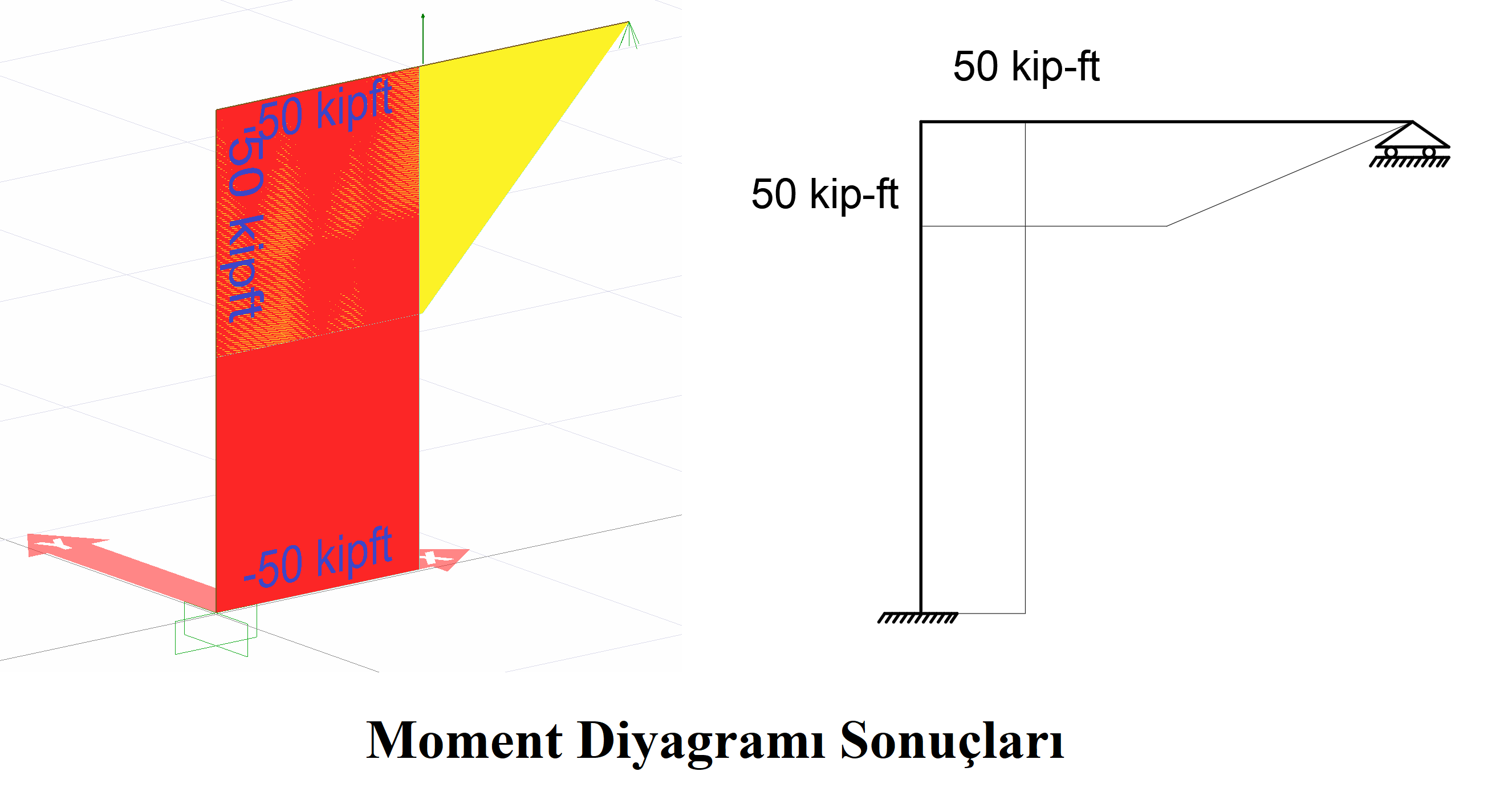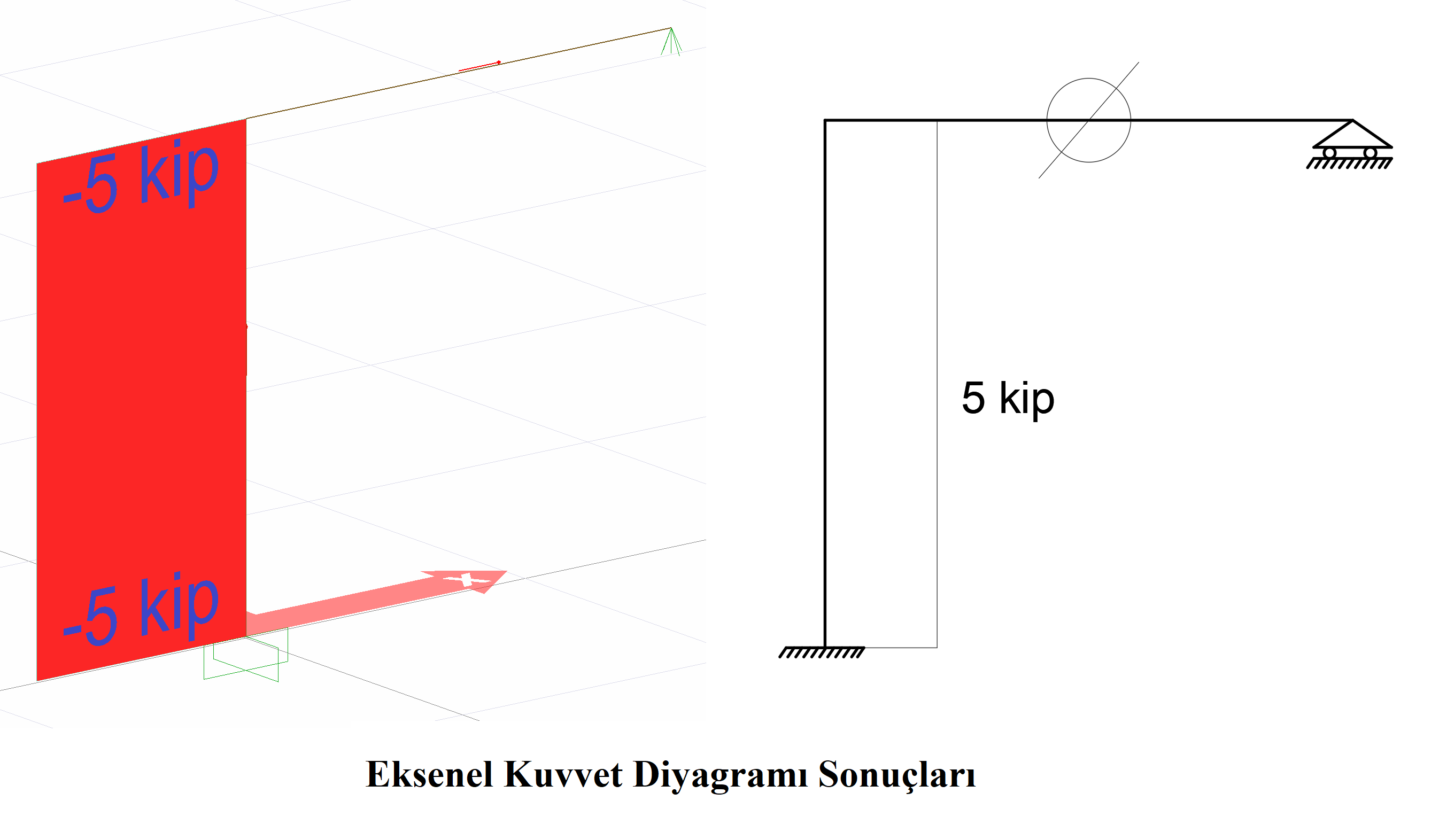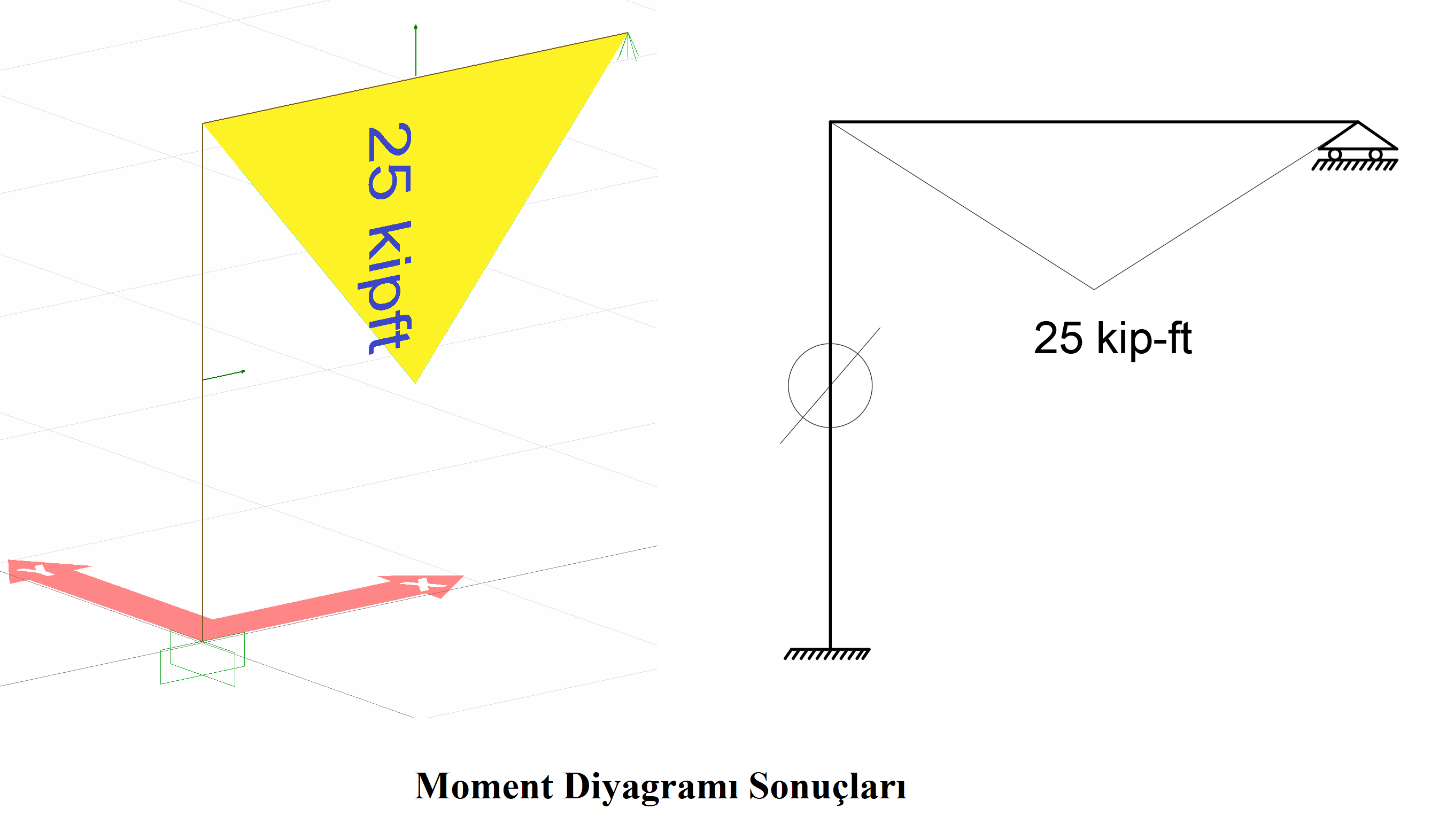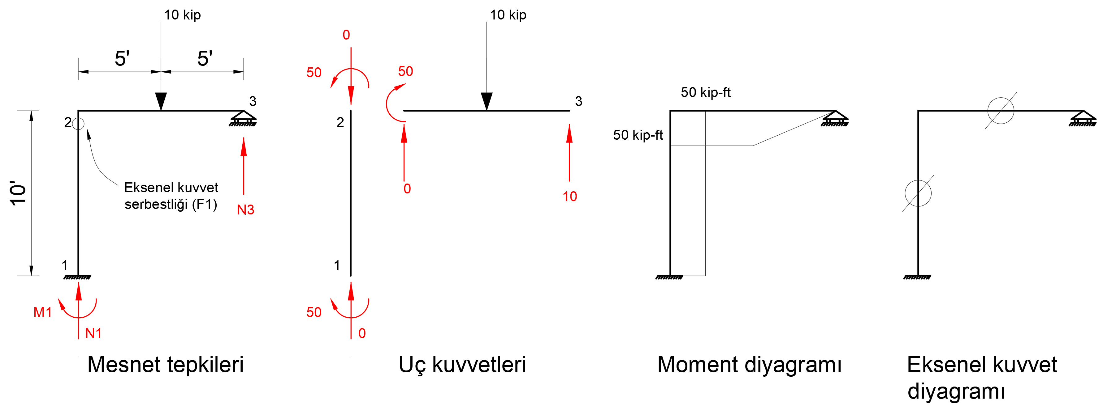 M1 serbestliğinden ötürü 1-2 düğüm noktaları arasında kalan elemanda (kolonda) herhangi bir moment değeri oluşmamış yalnızca 5 kip lik bir eksenel kuvvet oluşmuştur. 2-3 düğüm noktaları arasında kalan elemanın sol ucunda moment serbestliği sağ ucunda ise hareketli mesnet oluğundan bu uçlarda bir moment oluşmayacak, tekil yük etkisinden ötürü çubuğun ortasında 5*5=25 kip-ft lik bir moment oluşacaktır. Ayrıca 10 kip lik düşey yükten ötürü 1 ve 3 numaralı mesnetlerde 5 kip lik bir mesnet tepkisi oluşacak ve kolonda düzgün yayılı 5 kip lik bir eksenel kuvvet oluşacaktır.