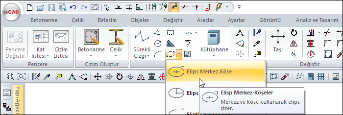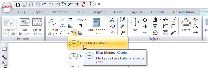 Elips Merkez-Köşeler komutu, üç elips çizim tekniğinden biridir. Bir merkez, bir köşe noktası belirlenerek elips oluşturulur.
