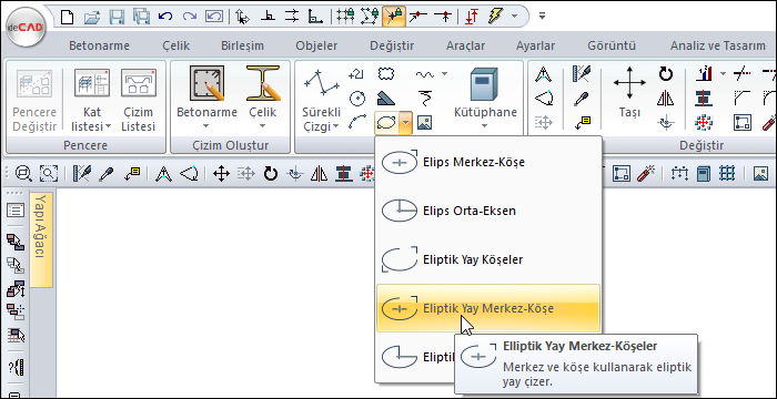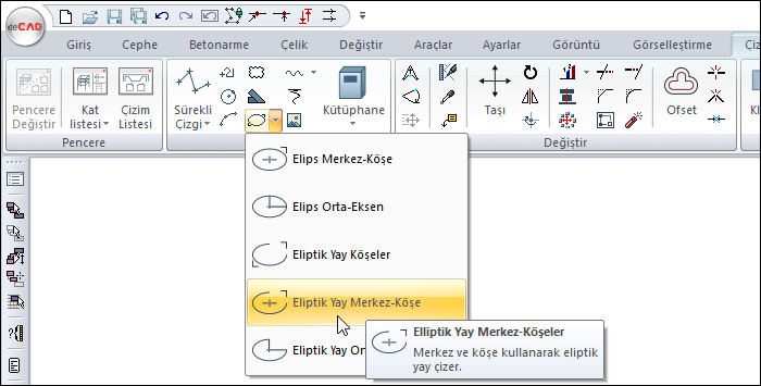 Ribbon menüde Eliptik Yay Merkez-Köşeler ikonunu tıklayın.