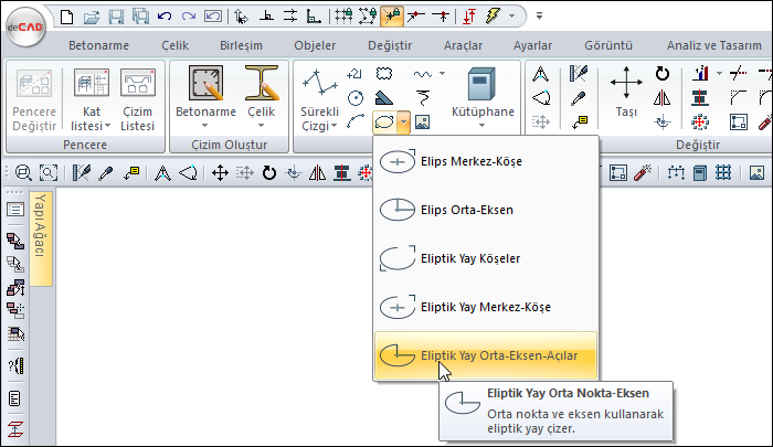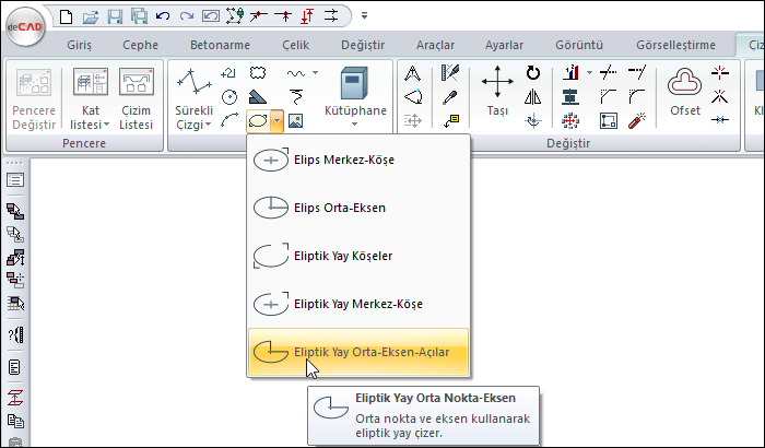 Ribbon menüde Eliptik Yay Orta-Eksen-Açılar ikonunu tıklayın.