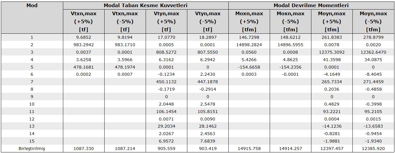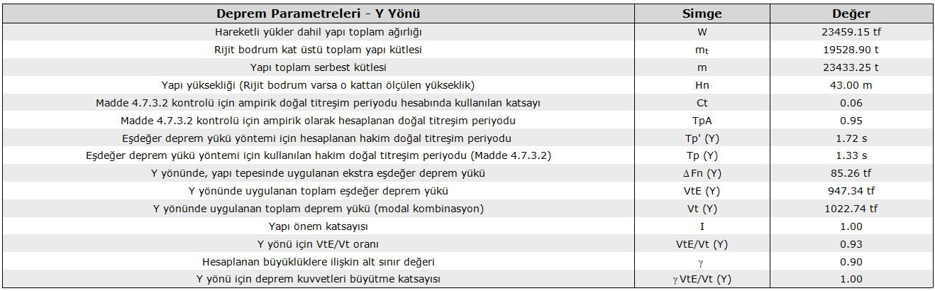 Dinamik analiz raporu deprem parametreleri tablosunda ilgili yön için hesapta kullanılan değerler ile hesap sonucu elde edilen büyütme katsayısı verilmektedir. Deprem yönetmeliği raporu Modal Taban Kesme Kuvvetleri bölümünde ise her bir doğrultu için modal analiz sonucu belirlenen her bir modun taban kesme kuvveti ile birleştirilmiş taban kesme kuvvetleri verilmektedir. Yine deprem yönetmeliği raporu düzensizlikler bölümünden, A1, B2 ve B3 düzensizliklerinden herhangi birinin olup olmamasına göre γE katsayısı otomatik belirlenir.