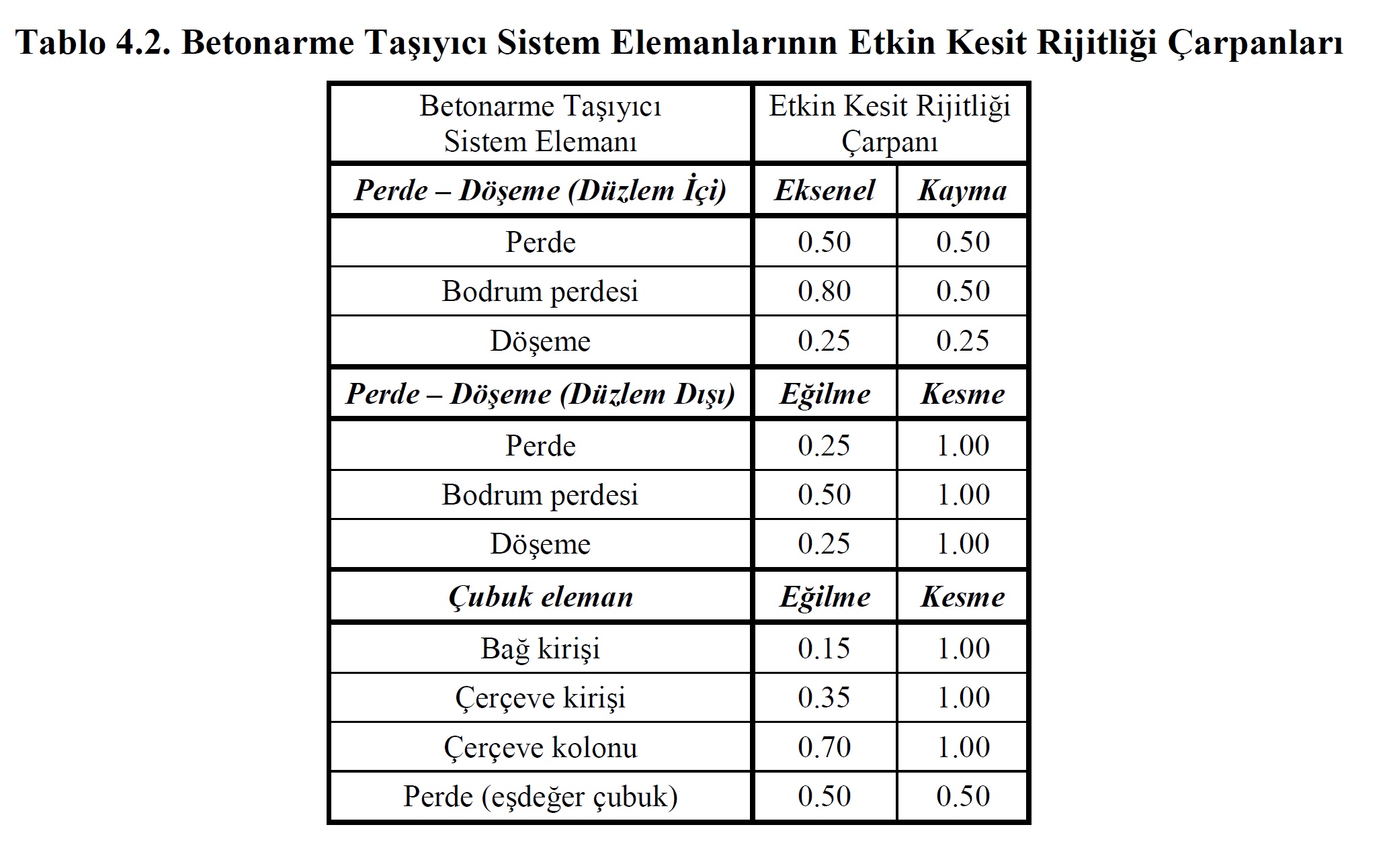 Mevcut binaların değerlendirilmesi kapsamında belirlenecek deprem performansında etkin kesit rijitlikleri TBDY 4.5.8 ‘de belirtilen Tablo 4.2 'ye göre yapılmaktadır.