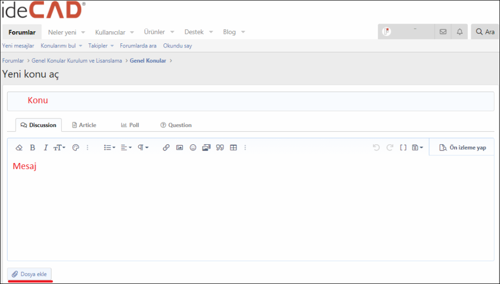 Forumda proje ile ilgili sorunuzu mesaj bölümüne ekleyin. Mesaj kısmı boş olarak gönderim yapılamaz.