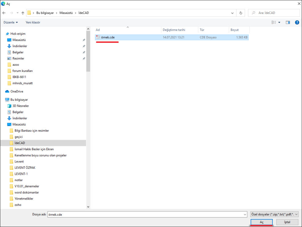 Açılan diyalogda eklemek istediğiniz *.cde" uzantılı ideCAD proje dosyasını seçin.