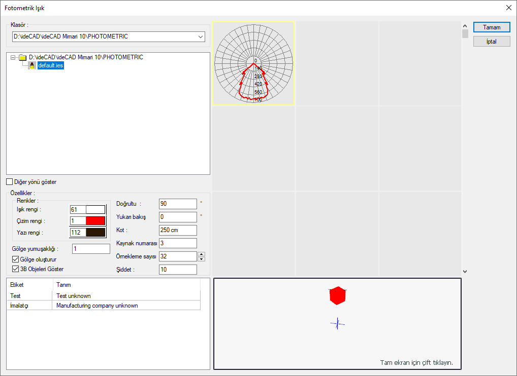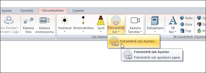 Fotometrik Işık Ayarları komutuyla ışık kaynağının doğrultusu, açısı, kotu, ışık rengi gibi ayarlarına ulaşılır.
