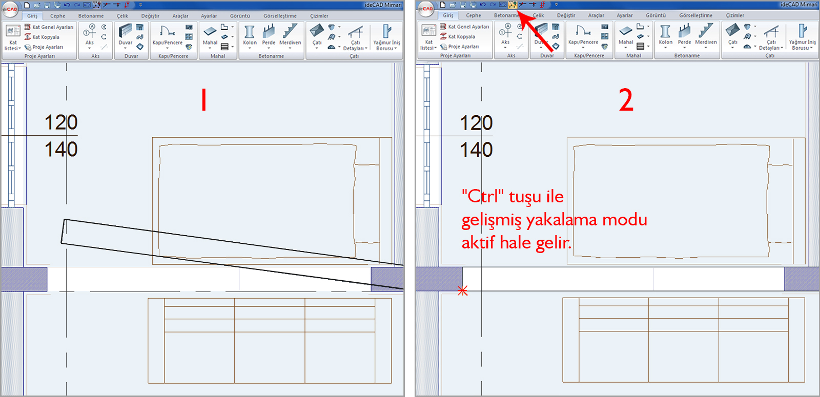 Bir obje yerleştirilirken ya da değiştirilirken klavyeden "Ctrl" tuşu basılı tutulursa, gelişmiş yakalama modu aktif hale getirilir. Izgara ve düğüm noktaları dışındaki noktalardan objenin yakalanması sağlanır.