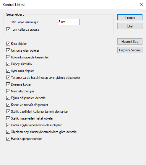 Ekrana gelen diyalogda, geometri kontrolü yapılacak durumları işaretleyin, kontrolün tüm katlar için yapılıp yapılmayacağını belirtin ve minimum obje uzunluğunu girin (Sıfır değeri uzunluk kontrolü yapılmayacak demektir).