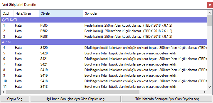 Kolon/kiriş-perde kesişimleri ![]() Birbirini kesen ve statik olarak ilişkili olmayan kiriş, perde ve kolonlar varsa listelenir. Bu durum kirişin veya perdenin kolonla temas etmemesinden kaynaklanır. |